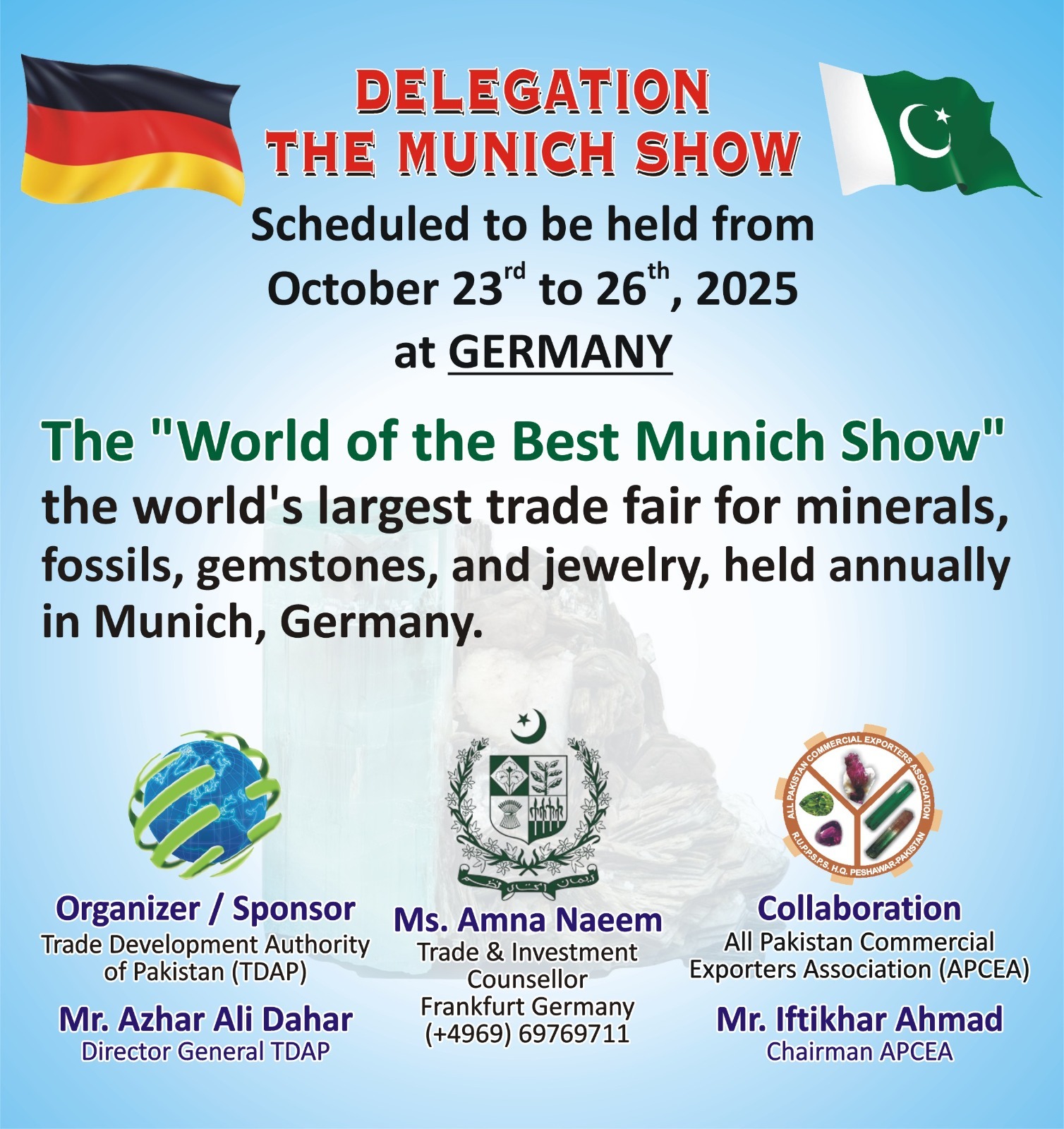 This year, Pakistan proudly presents its Pakistan Pavilion at the Munich Show 2025. Organized under the patronage of the Trade Development Authority of Pakistan (TDAP), in collaboration with the Consulate General of Pakistan in Frankfurt and the All Pakistan Commercial Exporters Association (APCEA), the pavilion represents a united effort to showcase Pakistan’s world-class mineral and gemstone sector on one of the most prestigious global stages.